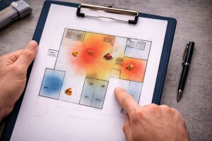 Áreas con calor, humedad, alimento o refugio tienden a concentrar actividad: cuartos de residuos, cocinas, depósitos con cajas en piso, salas técnicas, desagües y cielorrasos.